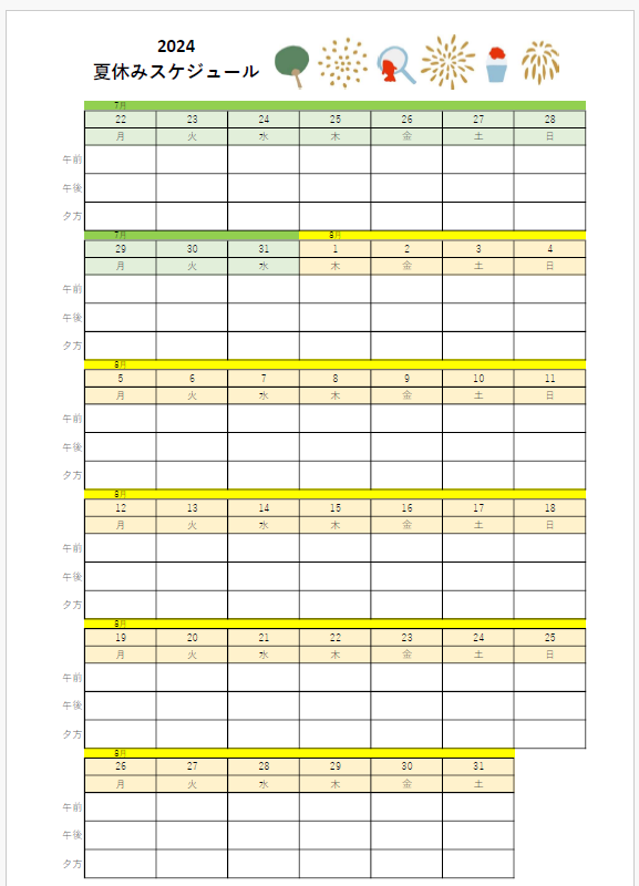 普段、私はスマホアプリでスケジュール管理をしていますが、夏休みは子ども達が予定を確認しやすいよう、この手書きのスケジュール表も併用しています。