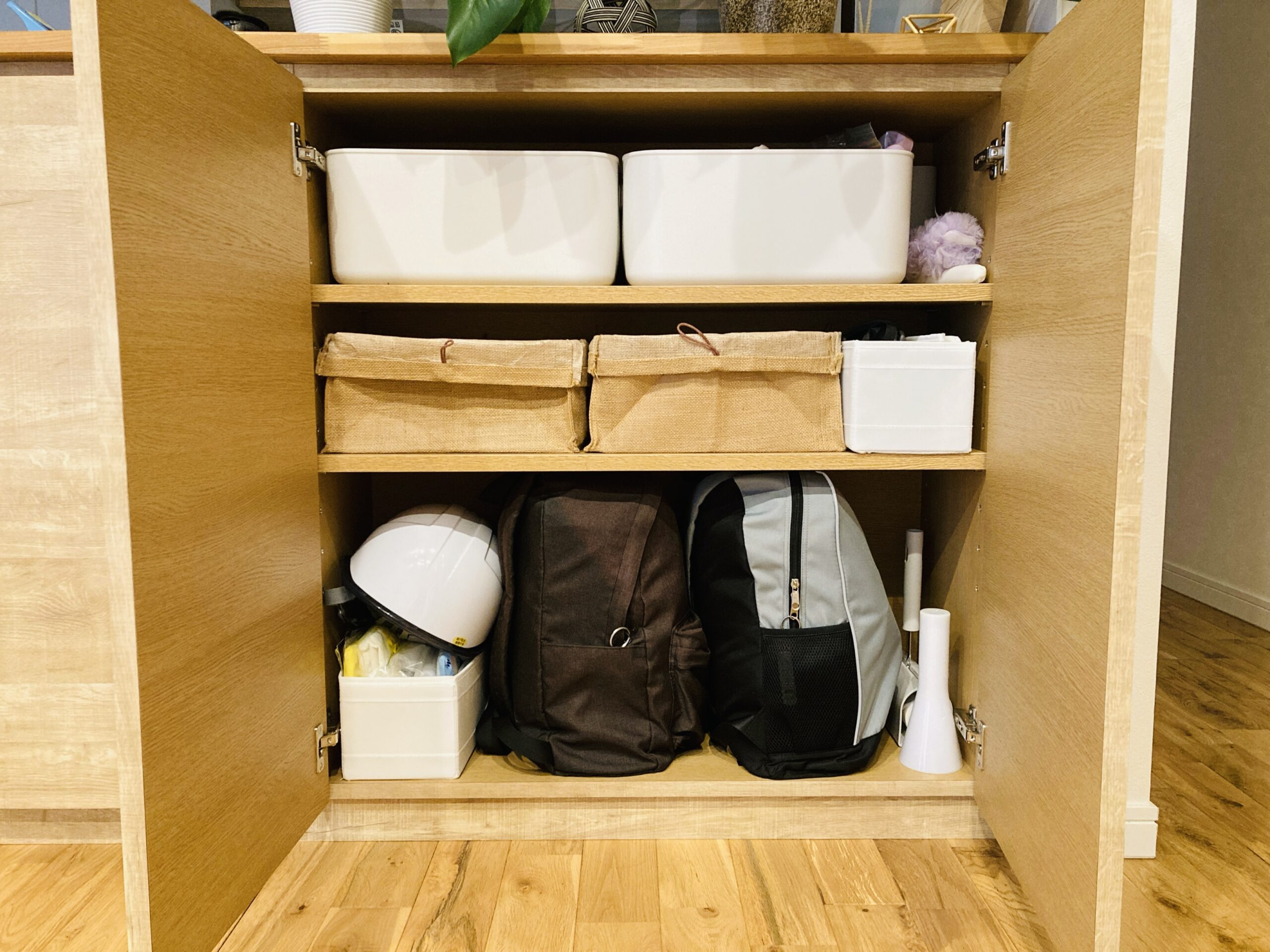 この場所にして良かった点は、持ち出しやすくなったこと、頻繁に開ける棚なのでよく目についてその存在を忘れないこと、そして、防災バッグの中身の入れ替えがしやすくなったことです。